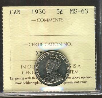 1930 5¢ ICCS MS63, scarce date.