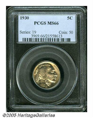 <B>1930<5C> Double Die Obverse MS66 PCGS.</B></I> FS-017. A lustrous example with golden color. The doubling is most apparent on the upper eyelid, nostril, upper lip, but most importantly on the date. The eye appeal is clearly that of a Superb Gem.