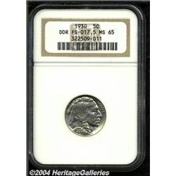 <B>1930<5C> Doubled Die Reverse MS65 NGC.</B></I> FS-017.5. This variety is identifiable by doubling on the bison's left foreleg. A film of light-gold toning graces both sides of this well struck and fully lustrous example. The only marks on the otherwise near-perfect surfaces are a couple of grazes on the Indian's jawbone and a few pinscratch-like abrasions on the bison's left shoulder. <BR><BR><B>Important notice:</B> Heritage usually auctions material at the rate of 200-250 lots per hour. On some occasions eBay Live bid software or the Internet may not be able to keep up with the pace of the auction. We recommend placing a realistic absentee bid now as insurance to avoid disappointment. Occasionally the auctioneer may eliminate or reject an eBay Live bid, and the auctioneer may also reopen a lot after the close of the eBay live bidding (usually because we missed an audience bid), and may reject your bid even if it shows you as the winning bidder. By bidding via eBay Live, you agree that Heritage may award the lot to another bidder at its sole discretion under the circumstances described above or any other reasonable circumstances. Since eBay bids are not shown to us until we open the lot on the floor, we treat those bids just like floor bids. In most cases the floor responds before the eBay bid is presented to us, due to Internet lag time, so for consistency we have made it a policy that floor bids are always considered first over tie eBay live bids. Also please note that all Heritage lots purchased through eBay Live carry a 20% Buyer's Premium. Please make sure you read the Terms and Conditions before you bid.