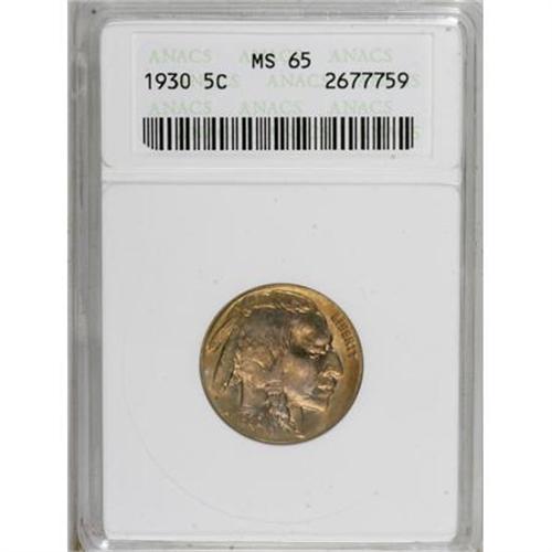 <B>1930 5C MS65 ANACS.</B></I> NGC Census: (362/74). PCGS Population (914/296). Mintage: 22,849,000. Numismedia Wsl. Price for NGC/PCGS coin in MS65: $188. (#3969)<BR><BR><B>Coin Engraver:</B> James E. Fraser<BR><BR><b>Shipping:</b> Coins & Currency (<a target="_blank" href="http://www.heritageauctions.com/common/shipping.php">view shipping information</a>)