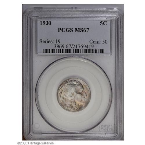<B>1930<5C> MS67 PCGS.</B></I> Well struck with unusually full luster and beautiful blazing apricot-gold and blue-gray colors. No surface marks are evident, even using magnification. NGC and PCGS combined report a mere 21 coins in MS67, and there is not a single example known any finer (10/05).