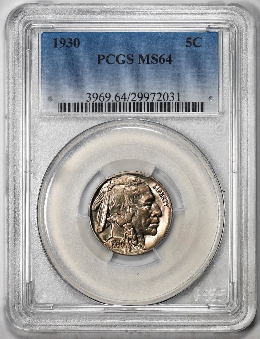 One 1930 Buffalo Nickel Coin PCGS MS64 Great Reverse Color. PCGS Graded.