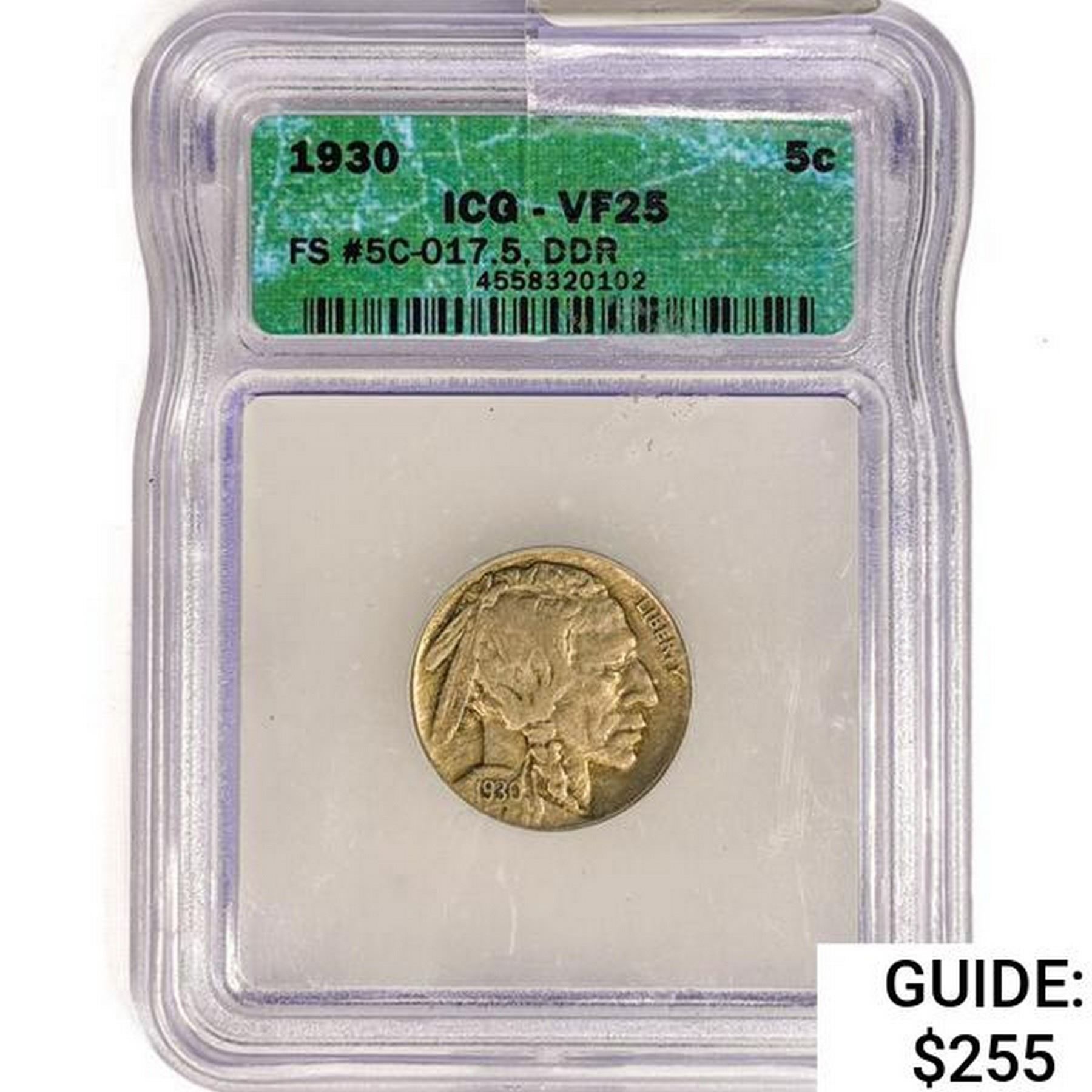 1930 Buffalo Nickel ICG VF25 DDR 5 Leg FS #5C-017.