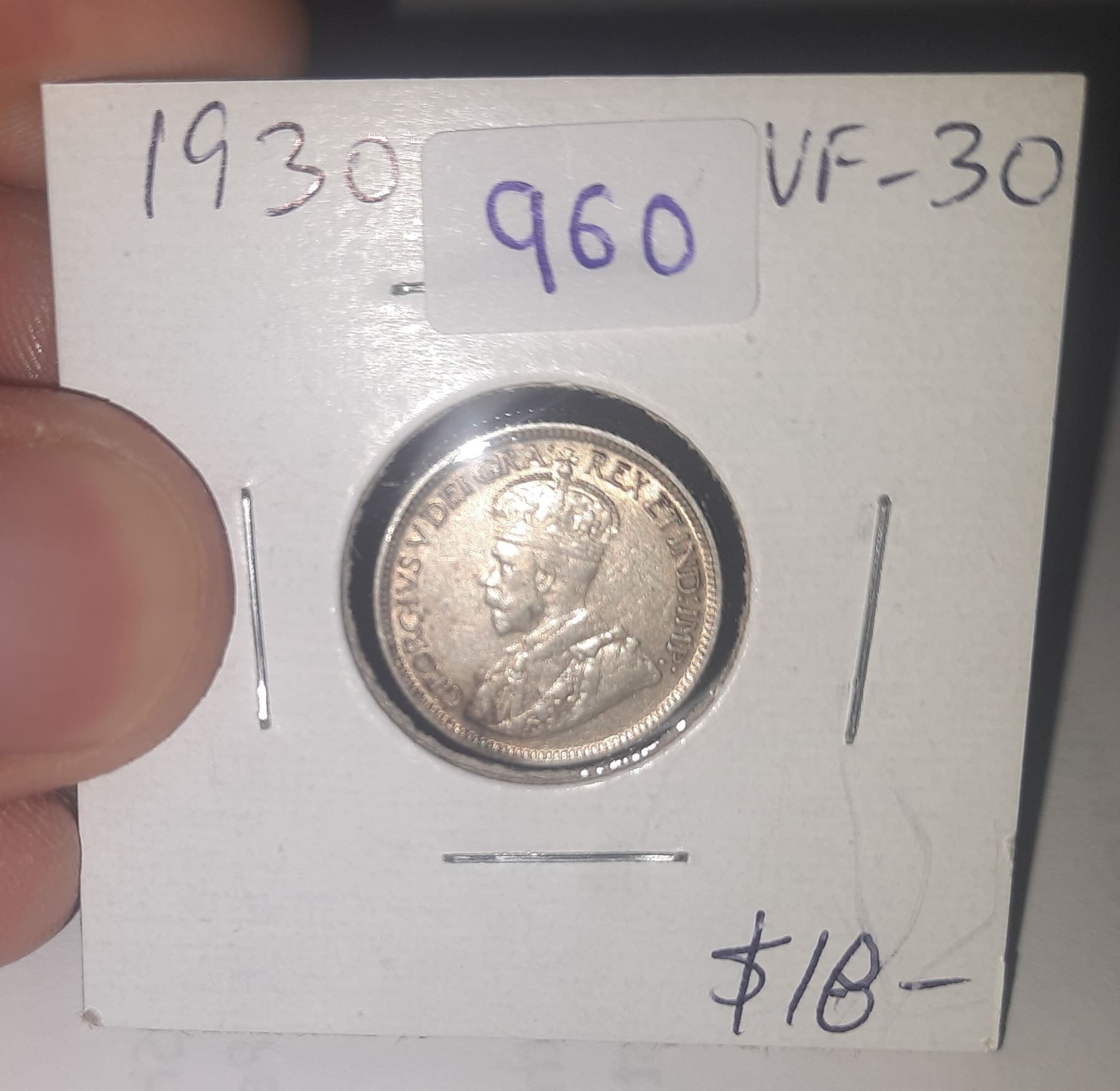 1930 Canadian Silver 10 Cents. Issued during the Great Depression. VF-30.