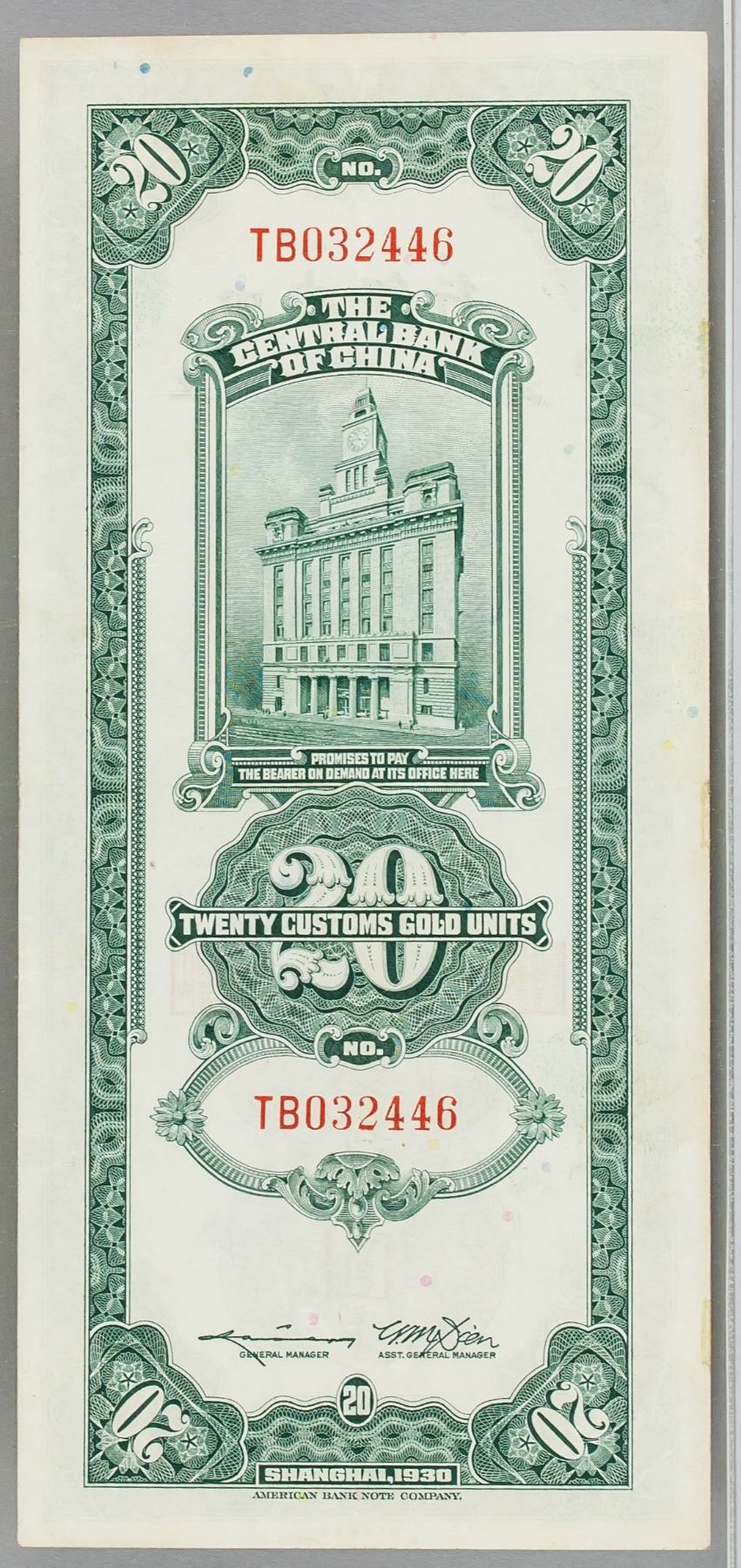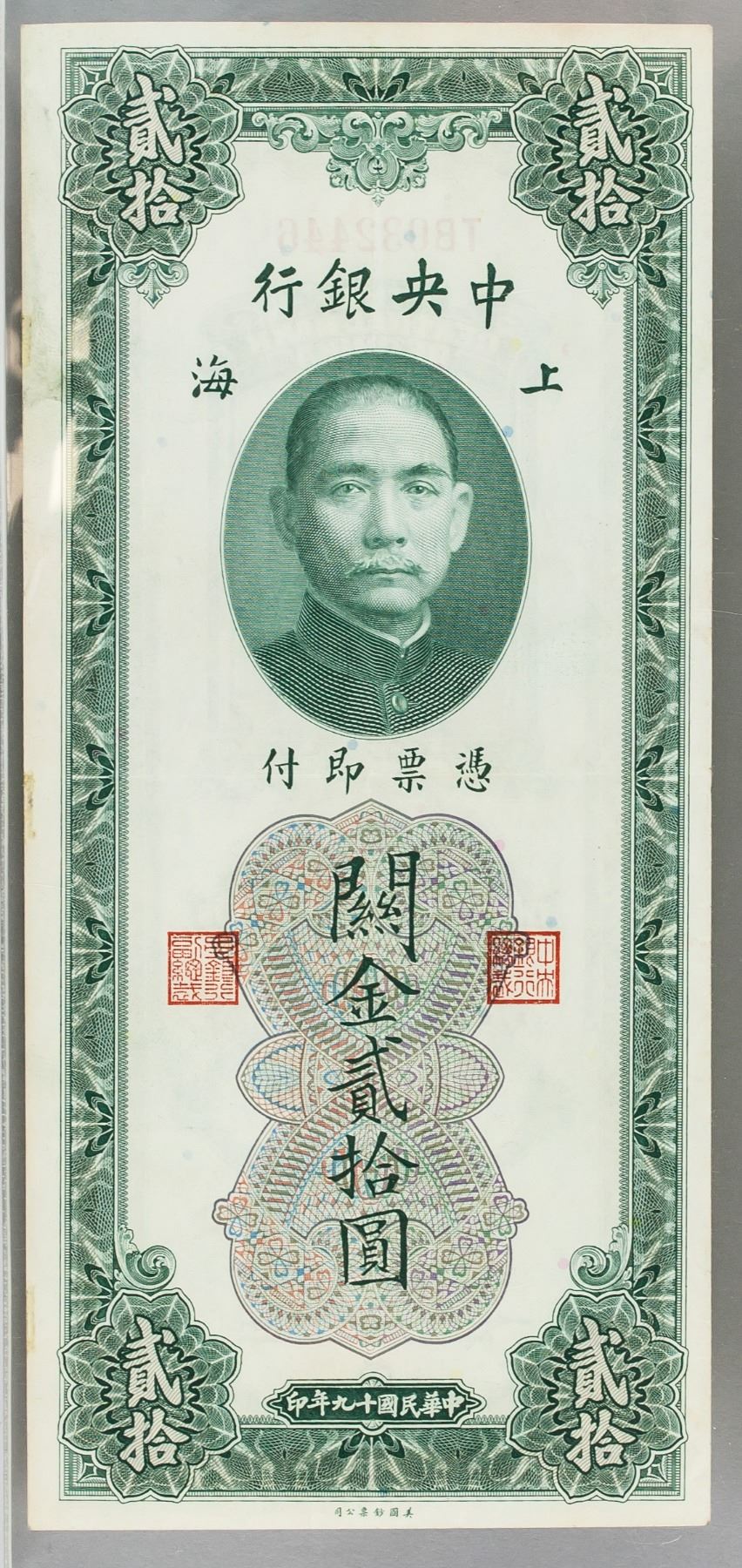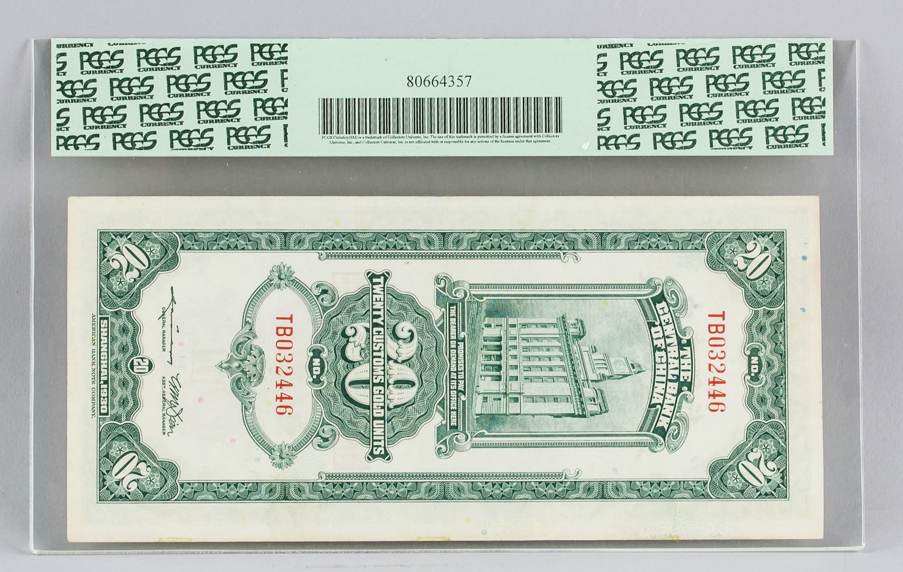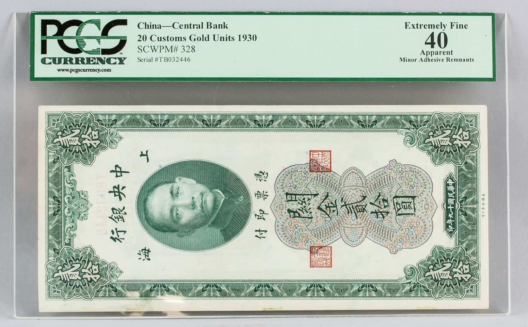 1930 China Republic 20 Dollar Customs gold banknote, Bank of China Shanghai, serial number TB032446, PCGS graded, Extremely Fine 40, Apparent, Minor Adhesive Remnants, certificate number 80664357, 8.7 x 19.2 cm