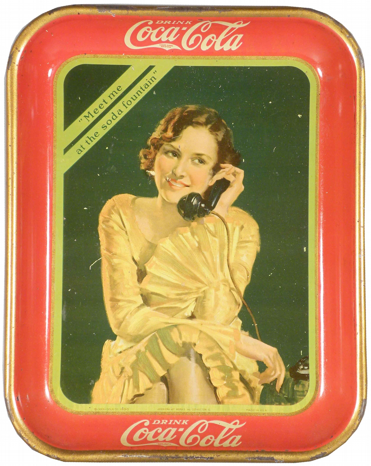 1930 Coca Cola Tin Serving Tray. Depicting girl on telephone entitled, "Meet me at the soda fountain". Edge ware and minor paint loss at center otherwise good condition. 10 1/2 X 13 inches.