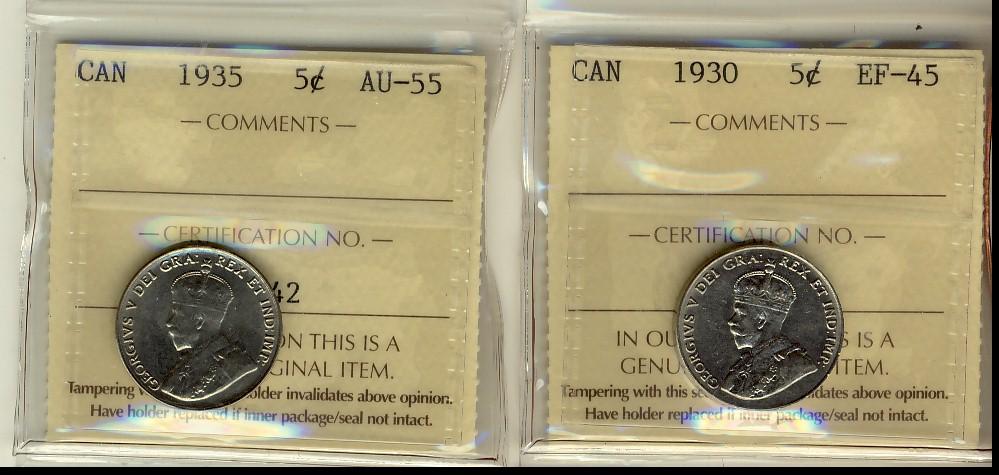 1930 EF45 & 1935 5¢ ICCS AU55. Lot of 2 coins.