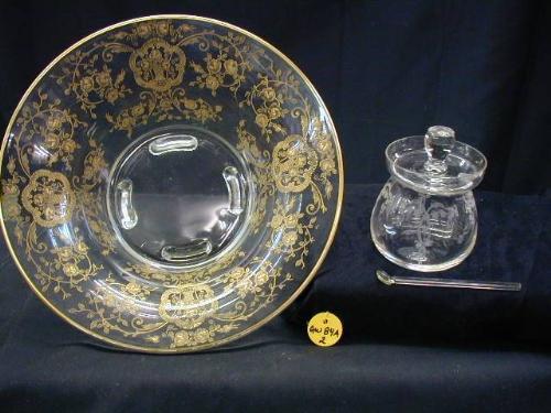 1930 ELEGANT GLASS INCLUDES (1) 10 1/2in FTD COMPOTE GOLD CABBAGE ROSE DESIGN EXCELLENT, (1) COVERED MUSTARD POT 3 3/8in (RIM HAS FLEA NIP) LILY OF THE VALLEY DESIGN W/GLASS SPOON