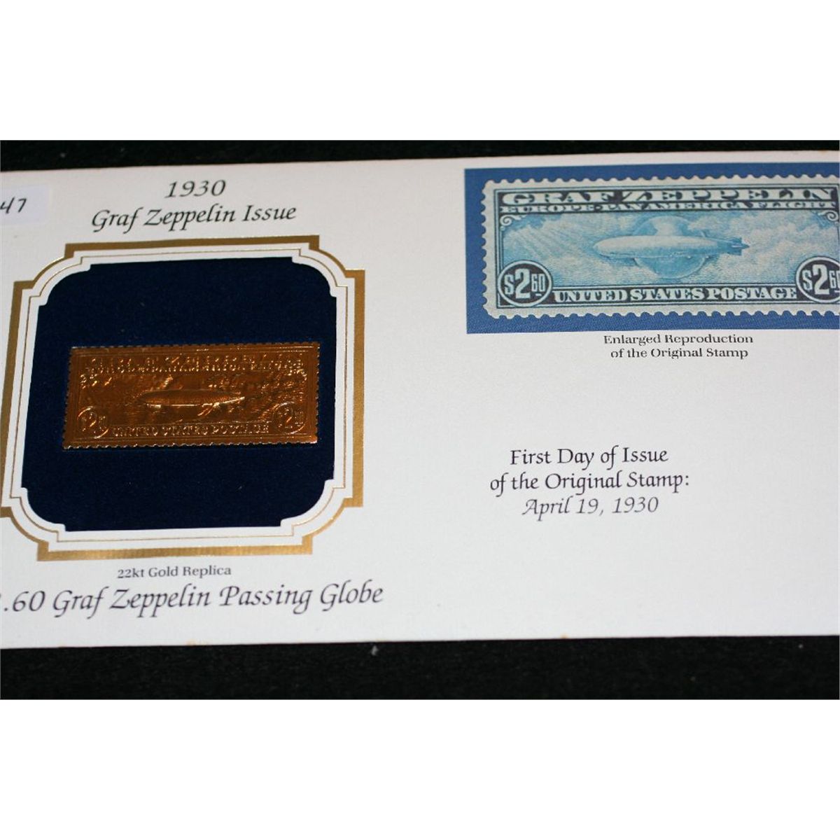 1930 First Day Issue stamp $2.60 Graf Zeppelin Passing Globe, replica w/stamp