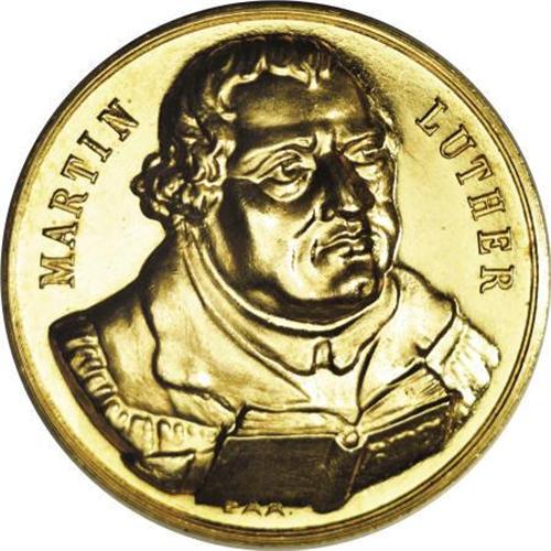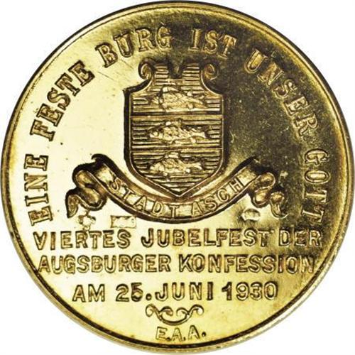 <B>1930 Germany Commemorating 400th Anniversary of the Augsburg Confession.</B></I> Gold, 22 mm, 6.4 gm. .750 fine (18-kt) medal struck in 1930 to commemorate the 400th anniversary of the famous 1530 Augsburg Confession. The obverse features a likeness of Martin Luther. <BR> <BR><BR><b>Shipping:</b> Coins & Currency (<a target="_blank" href="http://www.heritageauctions.com/common/shipping.php">view shipping information</a>)