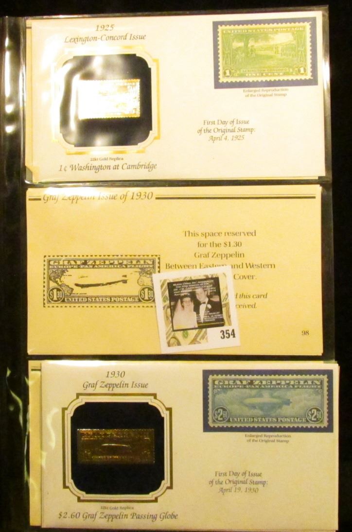 1930 Graf Zeppelin Issue $2.60 Graf Zeppelin Passing Globe 22Kt Gold Replica Stamp of First Day of Issue Cover & 1925 Lexington-Concord Issue 1c Washington at Cambridge 22 kt Gold Replica on First Day of Issue Cover.
