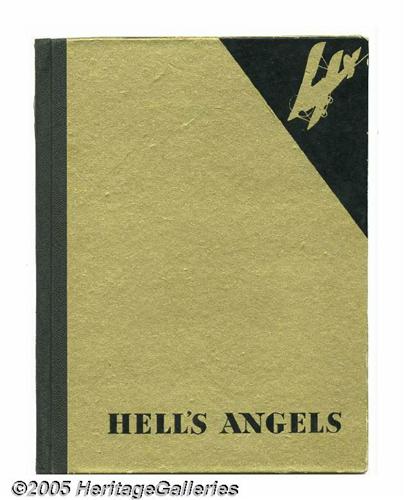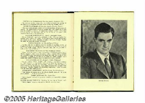 <B>1930 Howard Hughes' "Hell's Angels" Souvenir Book</B></I> Quoting from the first page of the book, <I>"'Hell's Angels' is unquestionably the most unusual and sensational picture in the history of the film industry. It was produced and directed by a boy who was only 23 years old when he started shooting the picture and who had only one thought in mind -- to make the greatest picture of all time."</B></I> Of course, this "boy" was the young millionaire filmmaker, Howard Hughes. His uncle, Rupert Hughes, was a screenwriter for Samuel Goldwyn and Hughes went to Hollywood in 1926 with a desire to make movies. He hired top-notch talent and signed a distribution deal with United Artists. <I>Hell's Angels</B></I> started out to be a silent film, but, after Hughes put a young Jean Harlow under contract, he re-worked many of the scenes and turned it into a talkie. One of the most famous movie quotes ever is from Jean Harlow, as Helen, saying <I>"Would you be shocked if I put on something more comfortable?"</B></I> Although the film was well-accepted and very successful, Hughes lost money on it; he spent over $3.8 million to make it! Offered here is an original souvenir book from the film with full cast and crew lists, photographs, plot summary and production information. It is approximately 5.5" x 6.5" in size and in fine condition save for mounting traces on the back board and some loose pages inside. An excellent item from this early epic film. Lot:254