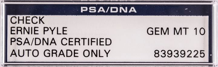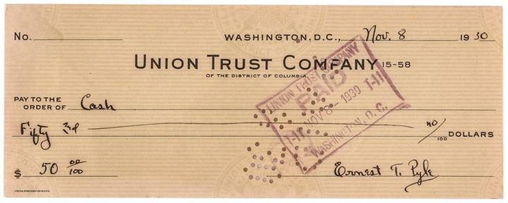 November 8, 1930-Dated, Partly-Printed Document, Check Signed, “Ernest T. Pyle”, 1 page, 7.75” x 3”, PSA/DNA Graded Gem Mint 10. Being a personal check both Engrossed and Signed by Pyle, made out to “Cash” in the amount of $50. Drawn on the Union Trust Company, District of Columbia. Tiny punch cancelled “PAID + 8 30” well away for the signature. The blank reverse is perfectly clean.