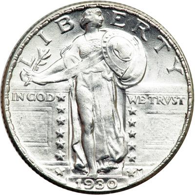 1930 Liberty Standing Quarter Dollar. NGC graded MS-61. A brilliant untoned example with the head nearly full.
