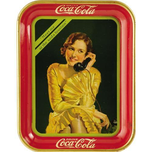 <B>1930 "Meet Me At the Soda Fountain" Coca-Cola Tray,</B></I> 10.5" x 13.25", by American Art Works, Coshocton, Ohio. A chipper lass accepts an irresistible invitation by phone. A good thing, too, since she and her ilk will ensure that Coca-Cola survives the Great Depression. Wear and light scratches from normal use, however the subject is remarkably free of visual detractions. Very fine condition.<BR><BR><b>Shipping:</b> Miscellaneous Collectibles, Larg (<a target="_blank" href="http://www.heritageauctions.com/common/shipping.php">view shipping information</a>)