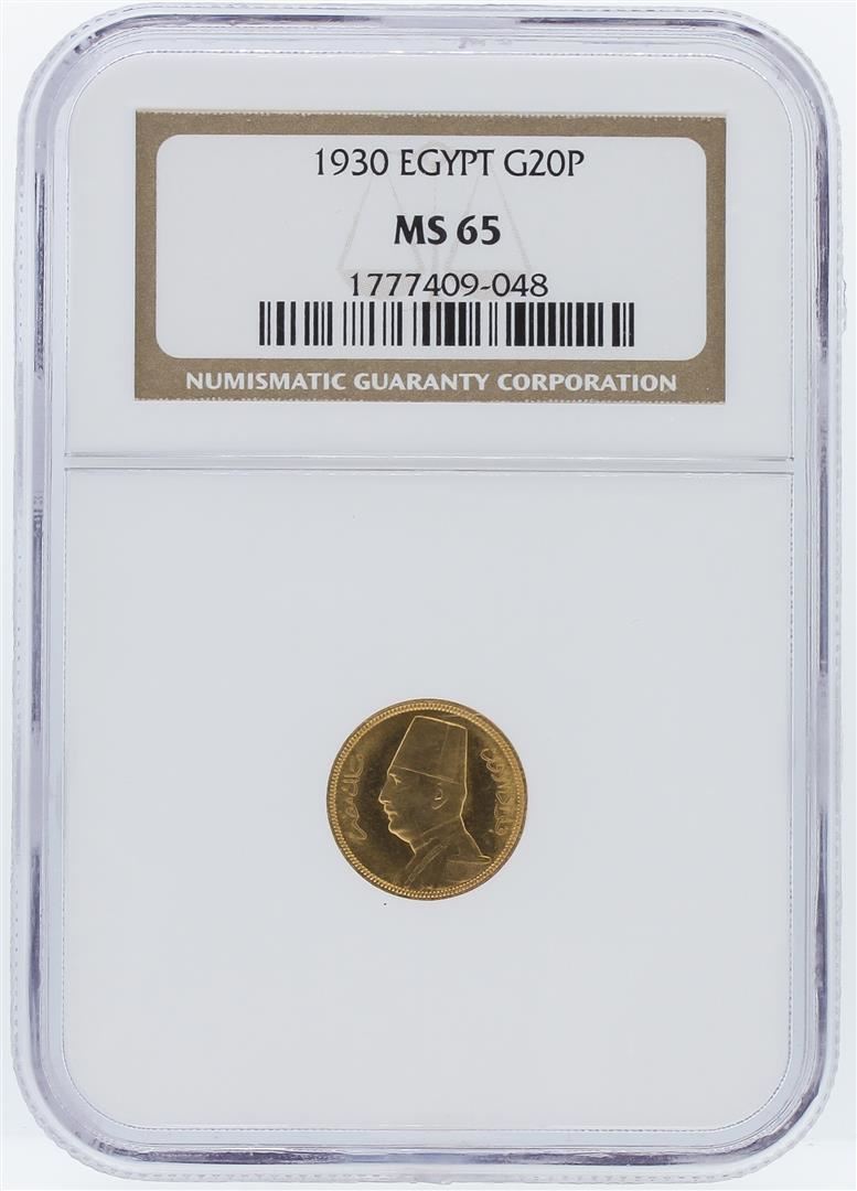 One 1930 NGC MS65 Egypt King Fuad 20 Piastres Gold Coin. NGC Certified.