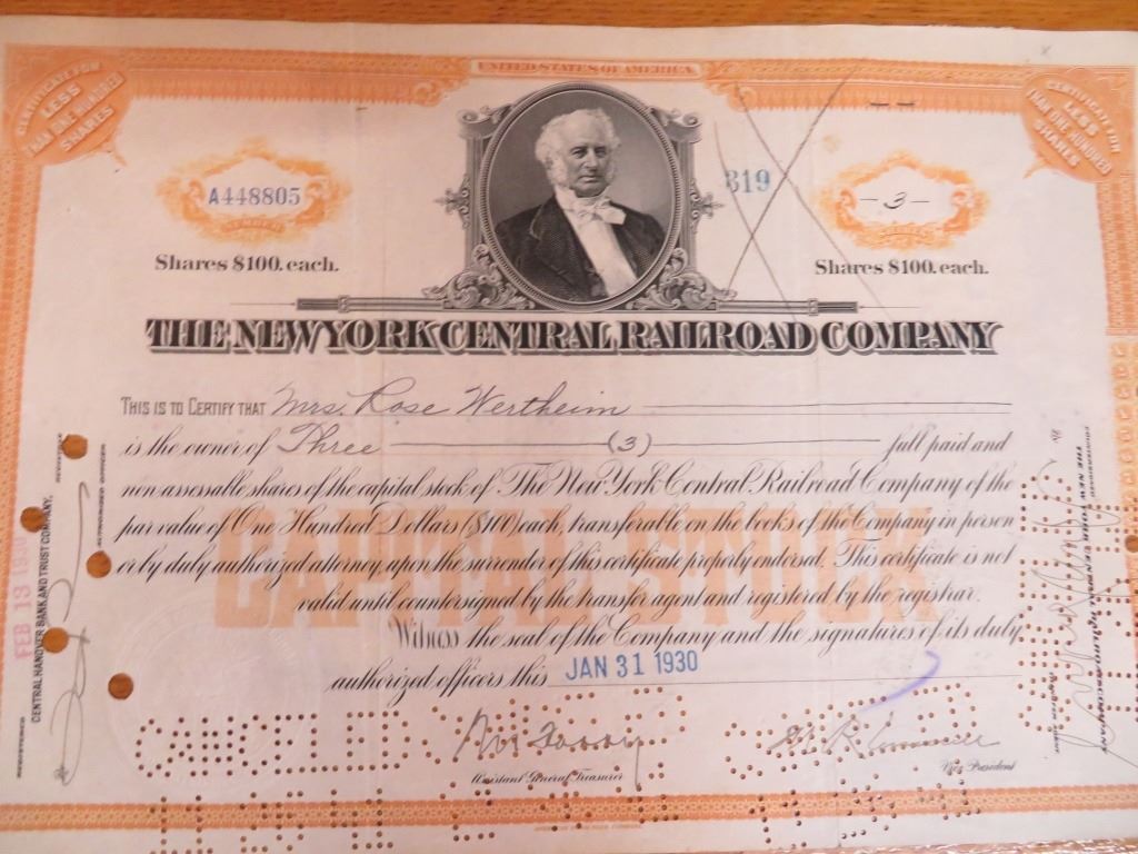 1930 NY Central R/R Stock Certificate