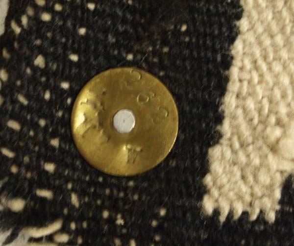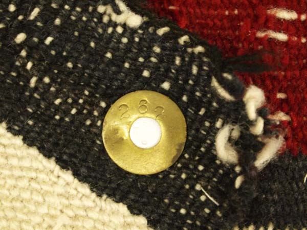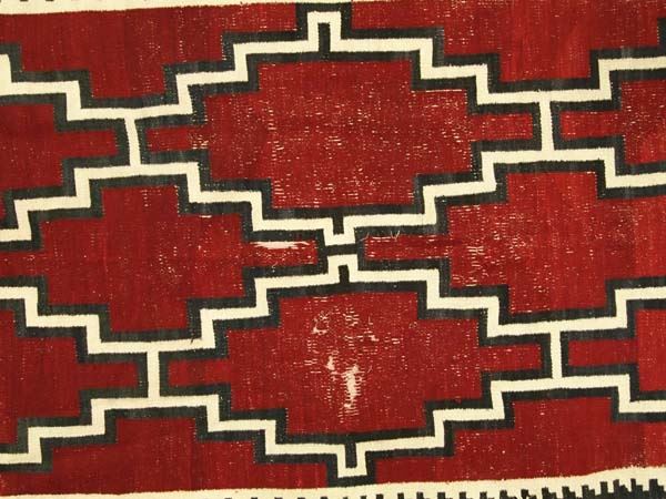 1930 Navajo Ganado Red Textile Rug, measures 85''L x 47''W, selvage damage, some small holes in interior, one on one edge, rug is thread bare in some areas, colors are bright and no bleeding, some hand stitched home repairs on corners, has brass ID tag on one corner