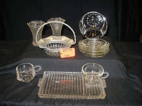 1930 PRESSED GLASS INCLUDES PR BUBBLE VASE 5in, CANDLEWICK SNACK TRAY, (4) SNACK TRAYS, ALUM. BRIDES BASKET, 10 PCS