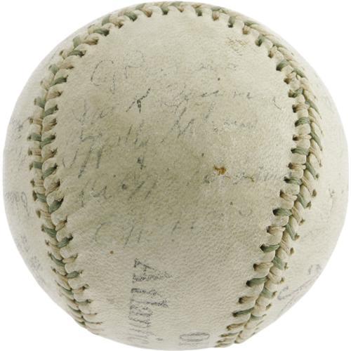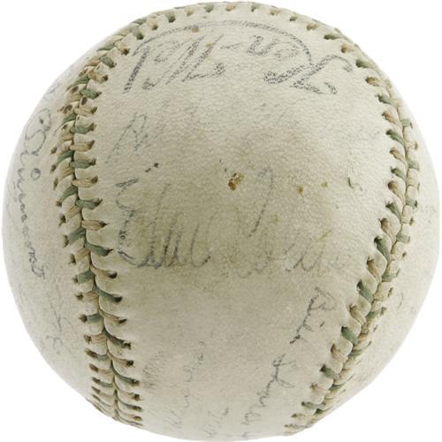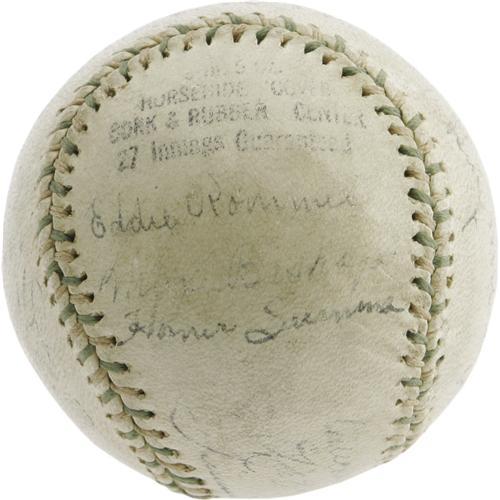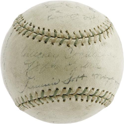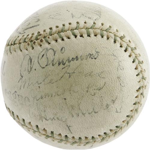 <B>1930 Philadelphia Athletics Team Signed Baseball.</B></I> This World Championship sphere offers the dreamiest display value possible, as Cochrane, Grove and Foxx are stacked on the sweet spot of an Official Atlantic City League ball. Those who can pull their attention away from the sight of this triumvirate will encounter further legends such as Collins and Simmons on the side panels, with starters Haas, Dykes, Miller, Bishop and Boley nearby. Signature quality ranges from barely visible to 8/10, with all Hall of Famers at least 5/10. But again, while there may be a few 1930 A's balls out there in superior condition, this is the first we've ever seen that offers such a perfect sweet spot for display. <I>LOA from PSA/DNA. LOA from James Spence Authentication.</B></I><BR><BR><b>Shipping:</b> Balls, Pucks, etc., Small (<a target="_blank" href="http://www.heritageauctions.com/common/shipping.php">view shipping information</a>)