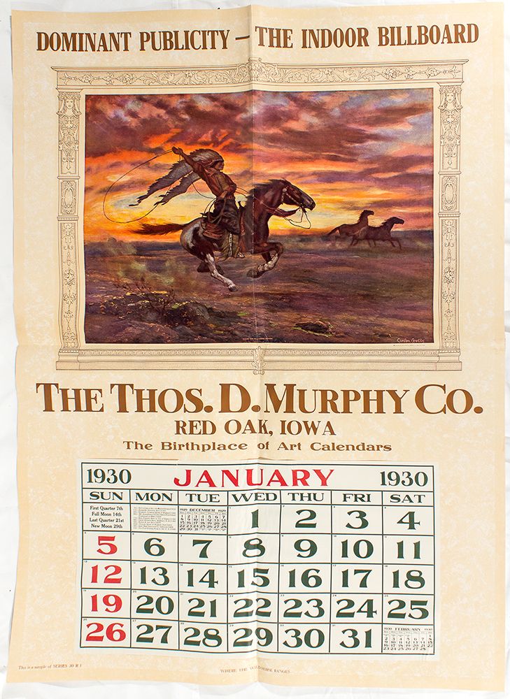 This is a beautiful 36"x 46" calendar broadside from 1930, with a beautiful Chas. Russell print"Where the Wild Horse Ranges" on the head piece. It's beautiful, dramatic and in nice condition. - HKA#65954