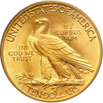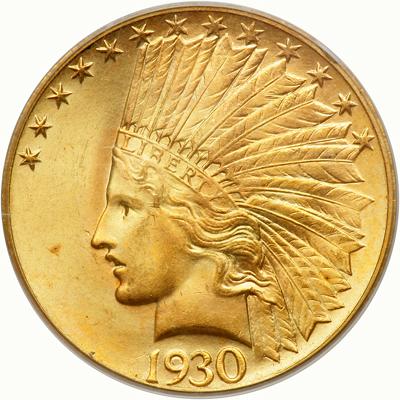 1930-S $10 Indian. PCGS graded MS-66 PQ. A fantastic gem example with stunning golden mint bloom color on both sides. One of five well-known keys to the beautiful Indian Eagle series, the 1930-S is the only $10 gold delivery of the 1927-1931 years. Survivors are much more elusive than even the limited original mintage of 96,000 might suppose. Authorities believe the issue experienced widespread melting by the Treasury Department in the 1930s. Most examples today exist in Mint condition, which is why the 1930-S is not rightly regarded as a condition rarity. With that in mind, the issue is an absolute rarity at the Mint State 66 level, there'll be no denying that, with precious few available for collectors per the population numbers which follow this description.