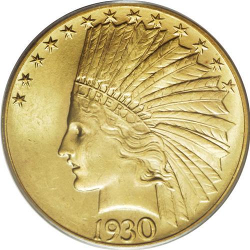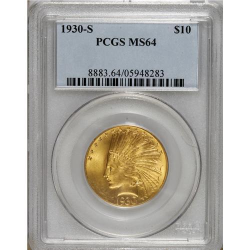 <B>1930-S $10 MS64 PCGS.</B></I> This issue is recognized as one of the important rarities in the Indian Head eagle series from a mintage that was limited to just 96,000 coins, the ninth lowest of the entire series including the Periods varieties of 1907. A few years earlier in 1926, the Philadelphia Mint struck over 1 million eagles, fulfilling the needs in commerce for the remainder of that decade. Only three more issues would follow, including this date and the 1932 and 1933 eagles. While a few hundred examples of the '30-S eagle survive in all grades, this issue is indeed a rarity in Choice and Gem quality. It was apparently not actually released into circulation, thus all known examples are in Mint State grades, and they survive due to the activities of coin collectors at the time, who obtained examples from local banks in their area, or from coin dealers who bought quantities of the date for sale to collectors. The balance of the original mintage was melted after the 1933 gold recall. We believe that 200 to 300 coins is a reasonable estimate of the survivorship. Some other dates actually have a smaller number of surviving Mint State coins, but almost every other instance has an additional quantity of circulated pieces that are available to collectors today.<BR> This near-Gem specimen is an appealing piece with fully brilliant and frosty yellow-gold color. A few small blemishes are evident on each side, the most noticeable being a small mark on Liberty's jaw. A small copper toning spot is visible near star 12 and a couple minute bagmarks can be seen in the reverse field. The overall strike is not full, but the design elements on each side are quite sharp. Population: 41 in 64, 19 finer (3/07).<BR><BR><b>Shipping:</b> Coins & Currency (<a target="_blank" href="http://www.heritageauctions.com/common/shipping.php">view shipping information</a>)