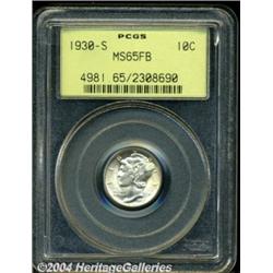 <B>1930-S<10C> MS65 Full Bands PCGS.</B></I>This lovely Gem has brilliant silver surfaces with pale gold toning. This date has the seventh lowest mintage of any Mercury dime issue, yet remains quite modestly priced, even in Gem quality.<BR><I>From The Reed Hawn Collection of Mercury Dimes.</B></I> <BR><BR><B>Important notice:</B> Heritage usually auctions material at the rate of 200-250 lots per hour. On some occasions eBay Live bid software or the Internet may not be able to keep up with the pace of the auction. We recommend placing a realistic absentee bid now as insurance to avoid disappointment. Occasionally the auctioneer may eliminate or reject an eBay Live bid, and the auctioneer may also reopen a lot after the close of the eBay live bidding (usually because we missed an audience bid), and may reject your bid even if it shows you as the winning bidder. By bidding via eBay Live, you agree that Heritage may award the lot to another bidder at its sole discretion under the circumstances described above or any other reasonable circumstances. Since eBay bids are not shown to us until we open the lot on the floor, we treat those bids just like floor bids. In most cases the floor responds before the eBay bid is presented to us, due to Internet lag time, so for consistency we have made it a policy that floor bids are always considered first over tie eBay live bids. Also please note that all Heritage lots purchased through eBay Live carry a 20% Buyer's Premium. Please make sure you read the Terms and Conditions before you bid. </span></font></tr></table></td></tr></table>