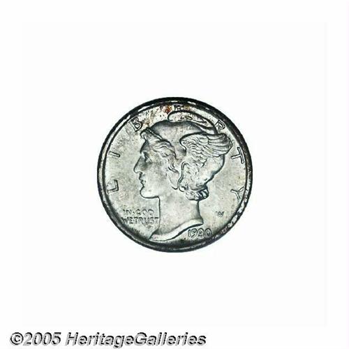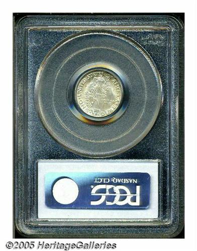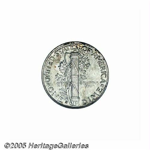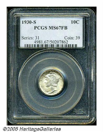 <B>1930-S<10C> MS67 Full Bands PCGS.</B></I> The otherwise silver-white surfaces exhibit dappled sprays of charcoal-brown toning around the obverse border, the reverse is more subtle in tone. The luster combines some attributes of frosty and satiny finishes, the surfaces are free of most trivial abrasions. Although not a great rarity in lower grades, the 1930-S is not well represented at the major grading services in the finer Full Bands grades. Population: 7 in 67, 0 finer (5/05).