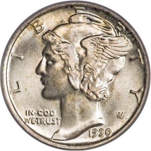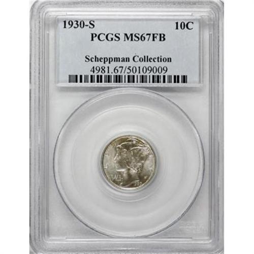 <B>1930-S 10C MS67 Full Bands PCGS.</B></I> A blush of rose graces the central devices, while sky-blue patina drapes the fields of this strongly lustrous and eminently appealing Superb Gem. Delightfully preserved and decisively struck with bands on the fasces that are not only split but fully rounded as well. Tied for the finest Full Bands example certified by either NGC or PCGS (12/07).<BR><I>From The Scheppman Collection, #4 PCGS Registry of Full Band Mercury Dimes.</B></I><BR><BR><B>Coin Engraver:</B> Adolph A. Weinman<BR><BR><b>Shipping:</b> Coins & Currency (<a target="_blank" href="http://www.heritageauctions.com/common/shipping.php">view shipping information</a>)