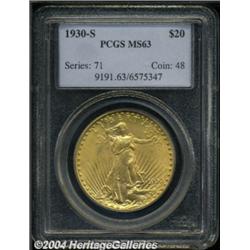 <table><tbody><tr><td><table> <TR><TD width="100%"><TABLE cellSpacing=1 cellPadding=3 width="100%" border=0><TBODY><TR><TD width="100%" bgColor=#79735c><FONT face=arial color=#ffffff size=3><B>Description</B> </FONT></TD></TR><TR><TD width="100%" bgColor=#ffffff><FONT face=arial size=2><B>1930-S $20 MS63 PCGS.</B></I> An exceedingly rare Saint-Gaudens issue that was extensively melted after a production run of just 74,000 pieces. Unlike other 1929-1932 issues, the supply of 1930-S twenties has not increased appreciably over the past few decades, leaving perhaps fewer than 60 coins extant today in all grades. Of the five collectible dates at the end of the Saint-Gaudens series, the '30-S is clearly the most difficult, and in Mint State the '30-S ranks from fourth to sixth, depending on the survey, of the 54 issues in the series. Only the legendary 1927-D is significantly more elusive as an Uncirculated coin. The surfaces are frosty with a thin coating of opaque color that is most discernible as the coin is turned under a light. There are very few abrasions on either side, and a diagnostic die scratch (as produced) is noted in the right obverse field, and there are several small, raised lumps within the last digit in the date.<BR><I>From a Magnificent Collection of Double Eagles.</B></I> </FONT></TD></TR></TBODY></TABLE></TD></TR></TBODY></TABLE><BR><A name=PricesRealized></A><TABLE cellSpacing=0 cellPadding=0 width="100%" bgColor=#000000 border=0><TBODY><TR><TD width="100%"><TABLE cellSpacing=1 cellPadding=3 width="100%" border=0><TBODY><TR><TD width="100%" bgColor=#79735c><A name=PR><FONT face=arial color=#ffffff size=3><B>Previous Prices from Heritage Auctions</B> </FONT></A></TD></TR><TR><TD bgColor=#f6f6ed><TABLE cellSpacing=0 cellPadding=0 width="100%" border=1><TBODY><TR><TD align=middle width="33%"><B>Date</B></TD><TD align=middle width="33%"><B>Service</B></TD><TD align=middle width="33%"><B>Price</B></TD></TR><TR bgColor=whitesmoke><TD width="33%"><B>01/07/2004</B></TD><TD width="33%">NGC</TD><TD width="33%">$51,750.00</TD></TR><TR bgColor=whitesmoke><TD width="33%"><B>02/23/2001</B></TD><TD width="33%">NGC</TD><TD width="33%">$26,450.00</TD></TR><TR bgColor=whitesmoke><TD width="33%"><B>08/01/1991</B></TD><TD width="33%">NGC</TD><TD width="33%">$23,100.00</TD></TR></TBODY></TABLE></TD></TR><TR><TD bgColor=#ffffff><FONT face=arial size=1 ?>PLEASE NOTE: All prices realized reflect the final hammer price PLUS the buyer's premium in auctions that charge a buyer's premium. Each item has a notation at the top of the listing indicating whether that lot included a buyer's premium. Example: A item that sells with a final hammer price of $100 and a 20% buyer's premium will display with a price realized of $120. All information listed is intended to be as accurate as possible, but errors are possible. Please use this guide carefully and inform us of any inaccuracies. </FONT></TD></TR></TBODY></TABLE></TD></TR></TBODY></TABLE><BR><TABLE cellSpacing=0 cellPadding=0 width="100%" bgColor=#000000 border=0><TBODY><TR><TD width="100%"><TABLE cellSpacing=1 cellPadding=3 width="100%" border=0><TBODY><TR><TD width="100%" bgColor=#79735c colSpan=6><FONT face=arial color=#ffffff size=3><B>Price Guide*</B> </FONT></TD></TR><TR bgColor=#f6f6ed><TD align=middle><B>Grade</B> </TD><TD align=middle><B>Coin World<BR>(Trends)</B> </TD><TD align=middle><B>Numismedia<BR>Retail</B> </TD><TD align=middle><B>Numismedia<BR>Wholesale</B> </TD><TD align=middle><B>Coin<BR>Universe</B> </TD><TD align=middle><B>Heritage<BR>Value Index</B> </TD></TR><TR bgColor=#ffffff><TD align=middle>62</TD><TD align=right>$40,000.00</TD><TD align=right>---</TD><TD align=right>$24,000.00</TD><TD align=right>$28,500.00</TD><TD align=right>$25,283.33</TD></TR><TR style="FONT-WEIGHT: bold" bgColor=#cccfdd><TD align=middle>63</TD><TD align=right>$50,000.00</TD><TD align=right>---</TD><TD align=right>$26,450.00</TD><TD align=right>$42,500.00</TD><TD align=right>$32,683.33</TD></TR><TR bgColor=#ffffff><TD align=middle>64</TD><TD align=right>$65,000.00</TD><TD align=right>---</TD><TD align=right>$31,000.00</TD><TD align=right>$52,500.00</TD><TD align=right>$40,016.67</TD></TR><TR bgColor=#ffffff><TD colSpan=6><FONT size=1>*All information listed is intended to be as accurate as possible, but errors are possible. No item may be returned or refused based on this information which is provided as a service to our customers. You should contact each pricing source directly to determine the accuracy of this information. </FONT></TD></TR></TBODY></TABLE></TD></TR></TBODY></TABLE><BR><TABLE cellSpacing=0 cellPadding=0 width="100%" bgColor=#000000 border=0><TBODY><TR><TD width="100%"><TABLE cellSpacing=1 cellPadding=3 width="100%" border=0><TBODY><TR><TD width="100%" bgColor=#79735c><FONT face=arial color=#ffffff size=3><B>Population Guide</B> </FONT></TD></TR><TR bgColor=#ffffff><TD align=middle><!-- Begin Output of Population Grid--><TABLE cellSpacing=0 cellPadding=0 width="100%" border=0><TBODY><TR><TD vAlign=center><TABLE cellSpacing=0 width="100%" border=1 cellsadding="3"><TBODY><TR><TD vAlign=center><TABLE cellSpacing=0 cellPadding=3 width="100%" border=1><TBODY><TR><TD vAlign=center align=middle bgColor=#f0f1e8 colSpan=2 <CENTER><FONT face=Arial size=2><B>PCGS Pop </B></FONT><CENTER></CENTER></TD><TD vAlign=center align=middle bgColor=#f0f1e8 colSpan=2><CENTER><FONT face=Arial size=2><B>NGC Pop</B></CENTER></FONT></TD></TR><TR><TD vAlign=center><FONT face=Arial size=2>(63)</FONT> </TD><TD vAlign=center align=right><FONT face=Arial size=2>2</FONT> </TD><TD vAlign=center><FONT face=Arial size=2>(63)</FONT> </TD><TD vAlign=center align=right><FONT face=Arial size=2>6</FONT> </TD></TR><TR><TD vAlign=center><FONT face=Arial size=2>(>63)</FONT> </TD><TD vAlign=center align=right><FONT face=Arial size=2>20</FONT> </TD><TD vAlign=center><FONT face=Arial size=2>(>63)</FONT> </TD><TD vAlign=center align=right><FONT face=Arial size=2>6</FONT> </TD></TR></T