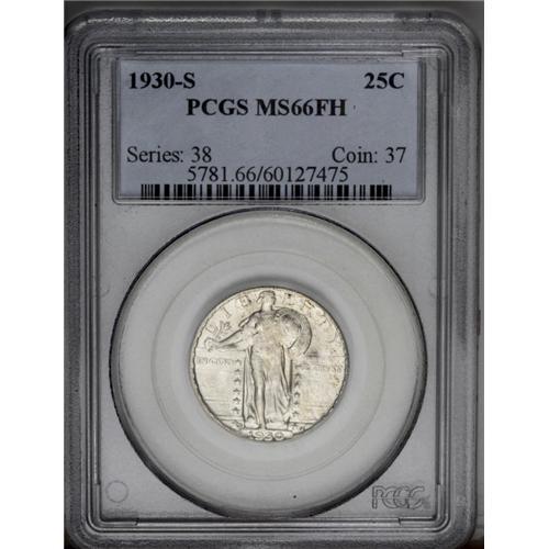 <B>1930-S<25C> MS66 Full Head PCGS.</B></I> Blazing luster dominates the light tan-gold surfaces of this suitably struck and carefully preserved final year Standing Liberty quarter. A low mintage issue and a Great Depression year, but a number were nonetheless set aside.