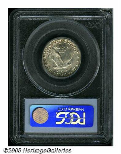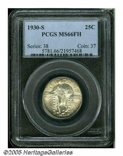 <B>1930-S<25C> MS66 Full Head PCGS.</B></I> Both sides are awash in radiant luster, and are visited by dappled russet and sea-blue patina around the borders. This issue is not usually found with a Full Head. The Premium Gem we offer here exhibits not only Full Head definition, but is generally well struck throughout. The inner shield and a couple of the lower rivets are weak, as is typical for the date. A few trivial marks on Liberty do not distract. Population: 75 in 66, 16 finer (6/05).