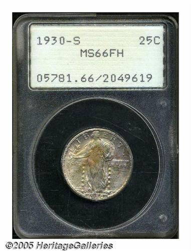<B>1930-S<25C> MS66 Full Head PCGS.</B></I> Mottled, multicolored iridescence adorns both sides and attests to this coin's originality. As befits the Full Head designation, the strike is razor sharp throughout. Housed in an early PCGS holder.
