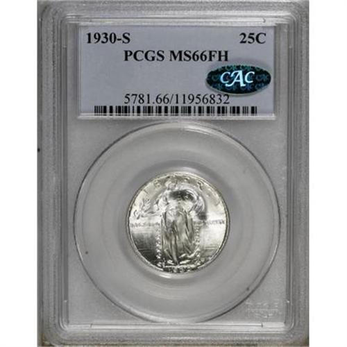 <B>1930-S 25C MS66 Full Head PCGS. CAC.</B></I> Shimmering luster exudes from the untoned, impeccably preserved surfaces of this magnificent Premium Gem quarter. A well executed strike culminates in a Full Head on Liberty. Population: 84 in 66 Full Head, 17 finer (1/08).<BR><BR><B>Coin Engraver:</B> Hermon A. MacNeil<BR><BR><b>Shipping:</b> Coins & Currency (<a target="_blank" href="http://www.heritageauctions.com/common/shipping.php">view shipping information</a>)