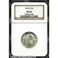 <B>1930-S<25C> MS66 NGC.</B></I> A thin tan veneer adheres to lustrous surfaces, slightly more noticeable on the obverse. The devices are sharply impressed, and the surfaces are essentially free of serious marks. Population: 44 in 66, 19 finer (9/04). <BR><BR><B>Important notice:</B> Heritage usually auctions material at the rate of 200-250 lots per hour. On some occasions eBay Live bid software or the Internet may not be able to keep up with the pace of the auction. We recommend placing a realistic absentee bid now as insurance to avoid disappointment. Occasionally the auctioneer may eliminate or reject an eBay Live bid, and the auctioneer may also reopen a lot after the close of the eBay live bidding (usually because we missed an audience bid), and may reject your bid even if it shows you as the winning bidder. By bidding via eBay Live, you agree that Heritage may award the lot to another bidder at its sole discretion under the circumstances described above or any other reasonable circumstances. Since eBay bids are not shown to us until we open the lot on the floor, we treat those bids just like floor bids. In most cases the floor responds before the eBay bid is presented to us, due to Internet lag time, so for consistency we have made it a policy that floor bids are always considered first over tie eBay live bids. Also please note that all Heritage lots purchased through eBay Live carry a 20% Buyer's Premium. Please make sure you read the Terms and Conditions before you bid.