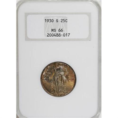 <B>1930-S 25C MS66 NGC.</B></I> Deep fire-red, apple-green, and plum-mauve patina embraces this lustrous and well preserved Premium Gem. An original prize for the connoisseur of colorfully toned coinage. Housed in an early, pre-hologram NGC holder.<BR><BR><b>Shipping:</b> Coins & Currency (<a target="_blank" href="http://www.heritageauctions.com/common/shipping.php">view shipping information</a>)