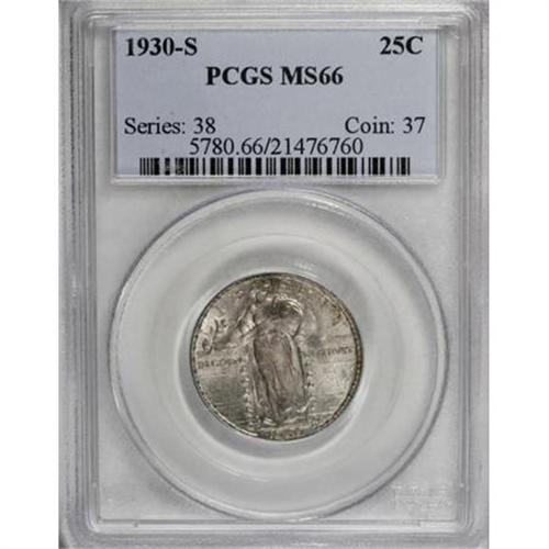 <B>1930-S 25C MS66 PCGS.</B></I> Light silver-gray drapes the softly lustrous surfaces of this final-year Standing Liberty quarter. Pleasingly defined for the issue, including above-average (though not full) detail on the head. PCGS has graded 23 finer pieces (10/07).<BR><BR><B>Coin Engraver:</B> Hermon A. MacNeil<BR><BR><b>Shipping:</b> Coins & Currency (<a target="_blank" href="http://www.heritageauctions.com/common/shipping.php">view shipping information</a>)