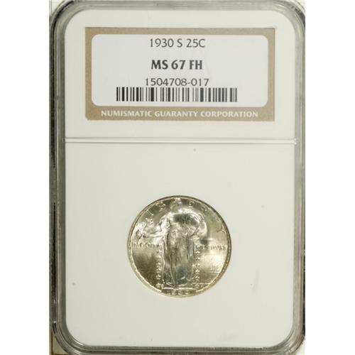 <B>1930-S 25C MS67 Full Head NGC.</B></I> An issue seldom found with Full Head details, since die life was prolonged when the Mint expected this to be the last year of the Standing Liberty quarter (as indeed it proved to be). Cline's <I>Standing Liberty Quarters,</B></I> third edition, estimates that 1% or less of this issue was struck with full heads. The present coin was struck from a worn die, but it is in quite an extraordinary state of preservation. This brilliant Superb Gem might be an excellent choice for anyone bold enough to attempt a last-year type set rather than the more pedestrian first-year type set. Census: 17 in 67 Full Head, 2 finer (1/07).<BR><BR><b>Shipping:</b> Coins & Currency (<a target="_blank" href="http://www.heritageauctions.com/common/shipping.php">view shipping information</a>)