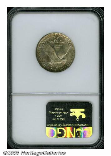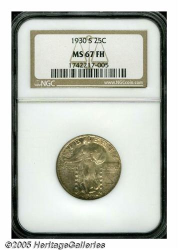 <B>1930-S<25C> MS67 Full Head NGC.</B></I> The variegated iridescence that adorns both sides is illuminated by vibrant underlying luster. Razor-sharp and essentially complete, the strike accentuates nearly every detail. Not even the most trivial contact mark breaks the continuity of the swirling mint luster. A beautiful Superb Gem that would enhance almost any high grade collection of Standing Liberty quarters. Population: 15 in 67, 2 finer (6/05).