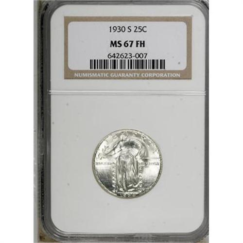<B>1930-S 25C MS67 Full Head NGC.</B></I> A stone-white Superb Gem that boasts blazing cartwheel luster and unblemished surfaces. The peripheral elements, including the all-important head, are well struck. Only the customary two shield rivets near the waist lack precise detail. Because of the Great Depression, the mintage of the 1930-S was only 1,556,000 pieces. Census: 19 in 67 Full Head, 2 finer (11/07).<BR><BR><B>Coin Engraver:</B> Hermon A. MacNeil<BR><BR><b>Shipping:</b> Coins & Currency (<a target="_blank" href="http://www.heritageauctions.com/common/shipping.php">view shipping information</a>)