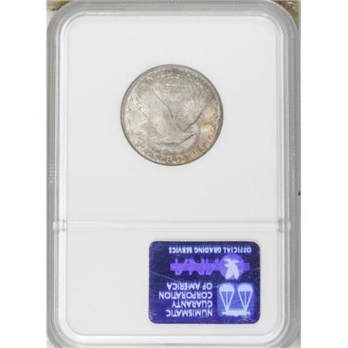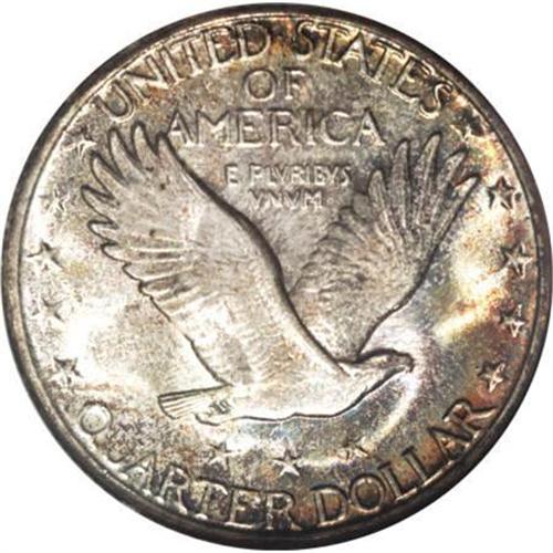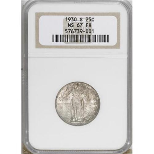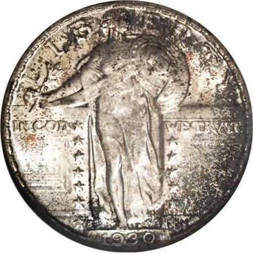 <B>1930-S 25C MS67 Full Head NGC.</B></I> This is a highly lustrous coin, antique silver in color with flecks of black, brick red, and deep green color visible over the obverse and swaths of indigo, gold and brick red adorning the reverse. A mere two coins of the date have been awarded a higher grade with the Full Head designation. Census: 19 in 67, 2 finer (11/07).<BR><BR><B>Coin Engraver:</B> Hermon A. MacNeil<BR><BR><b>Shipping:</b> Coins & Currency (<a target="_blank" href="http://www.heritageauctions.com/common/shipping.php">view shipping information</a>)