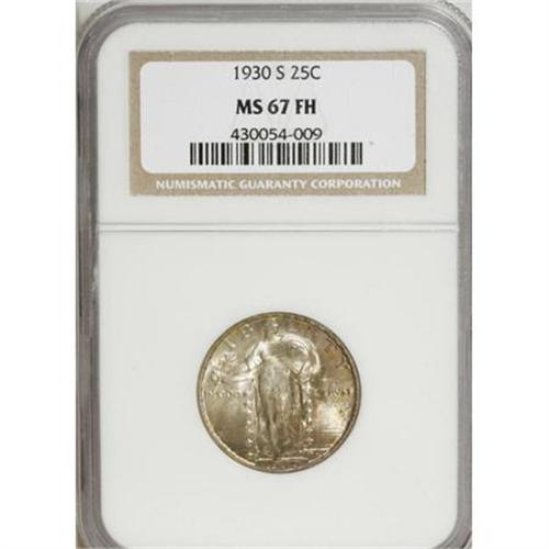 <B>1930-S 25C MS67 Full Head NGC.</B></I> The 1930-S typically comes with a flat head, resulting from the prolonged use of worn dies. The Superb Gem Full Head specimen in this lot is thus quite special, as one percent or less come with complete head detail (J.H. Cline, 2007). Light golden-tan and purple toning cover lustrous, well preserved surfaces. Census: 19 in 67 Full Head, 2 finer (1/08).<BR><BR><B>Coin Engraver:</B> Hermon A. MacNeil<BR><BR><b>Shipping:</b> Coins & Currency (<a target="_blank" href="http://www.heritageauctions.com/common/shipping.php">view shipping information</a>)