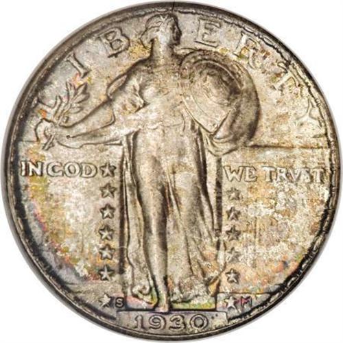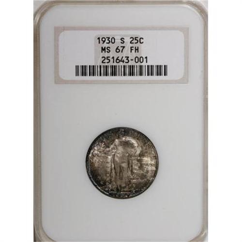 <B>1930-S 25C MS67 Full Head NGC.</B></I> Mottled steel-gray, olive, and russet is draped over the lustrous and remarkably unabraded surfaces. A beautiful Superb Gem type coin with a sharp strike and exceptional eye appeal. Certified in a prior generation holder. Census: 19 in 67 Full Head, 2 finer (3/08).<BR><BR><B>Coin Engraver:</B> Hermon A. MacNeil<BR><BR><b>Shipping:</b> Coins & Currency (<a target="_blank" href="http://www.heritageauctions.com/common/shipping.php">view shipping information</a>)