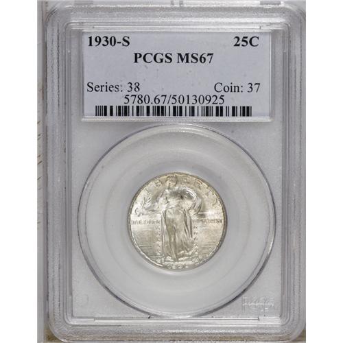 <B>1930-S 25C MS67 PCGS.</B></I> A delightful Superb Gem with pleasing luster and pale iridescent toning. The strike is nice for this issue, though the lack of an ear-hole precludes a Full Head designation. Population: 22 in 67, 0 finer (9/06).<BR><BR><b>Shipping:</b> Coin/Currency (<a target="_blank" href="http://www.heritageauctions.com/common/shipping.php">view shipping information</a>)