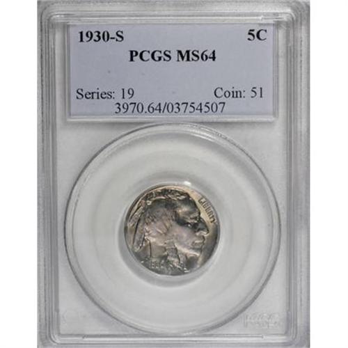 <B>1930-S 5C MS64 PCGS.</B></I> PCGS Population (421/480). NGC Census: (228/176). Mintage: 5,435,000. Numismedia Wsl. Price for NGC/PCGS coin in MS64: $180. (#3970)<BR><BR><B>Coin Engraver:</B> James E. Fraser<BR><BR><b>Shipping:</b> Coins & Currency (<a target="_blank" href="http://www.heritageauctions.com/common/shipping.php">view shipping information</a>)