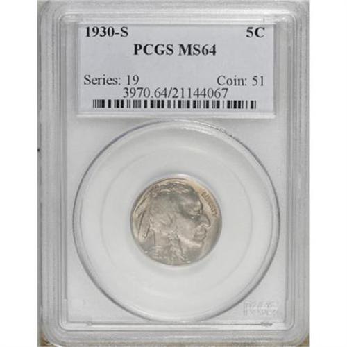 <B>1930-S 5C MS64 PCGS.</B></I> PCGS Population (430/513). NGC Census: (231/180). Mintage: 5,435,000. Numismedia Wsl. Price for NGC/PCGS coin in MS64: $180. (#3970)<BR><BR><B>Coin Engraver:</B> James E. Fraser<BR><BR><b>Shipping:</b> Coins & Currency (<a target="_blank" href="http://www.heritageauctions.com/common/shipping.php">view shipping information</a>)
