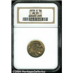 <B>1930-S<5C> MS65 NGC.</B></I> Sharply struck, except for a couple of areas of softness in the Indian's hair. Delicate light gold color with a splash or two of subtle violet overlays lustrous, impairment-free surfaces. <BR><BR><B>Important notice:</B> Heritage usually auctions material at the rate of 200-250 lots per hour. On some occasions eBay Live bid software or the Internet may not be able to keep up with the pace of the auction. We recommend placing a realistic absentee bid now as insurance to avoid disappointment. Occasionally the auctioneer may eliminate or reject an eBay Live bid, and the auctioneer may also reopen a lot after the close of the eBay live bidding (usually because we missed an audience bid), and may reject your bid even if it shows you as the winning bidder. By bidding via eBay Live, you agree that Heritage may award the lot to another bidder at its sole discretion under the circumstances described above or any other reasonable circumstances. Since eBay bids are not shown to us until we open the lot on the floor, we treat those bids just like floor bids. In most cases the floor responds before the eBay bid is presented to us, due to Internet lag time, so for consistency we have made it a policy that floor bids are always considered first over tie eBay live bids. Also please note that all Heritage lots purchased through eBay Live carry a 20% Buyer's Premium. Please make sure you read the Terms and Conditions before you bid.