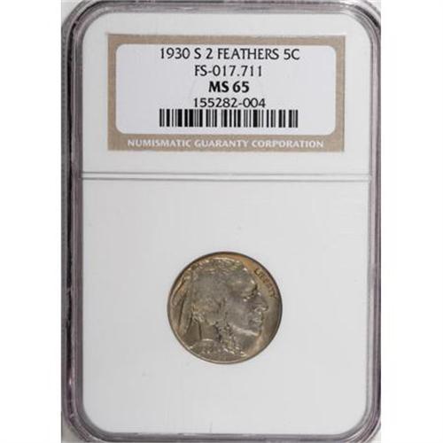 <B>1930-S 5C MS65 NGC.</B></I> FS-017.711. 2 Feathers. This highly lustrous Gem displays lovely steel-green and antique-gold toning. The bison's head and shoulder are a bit weak, and die clash marks are evident on both sides. <BR><BR><B>Coin Engraver:</B> James E. Fraser<BR><BR><b>Shipping:</b> Coins & Currency (<a target="_blank" href="http://www.heritageauctions.com/common/shipping.php">view shipping information</a>)