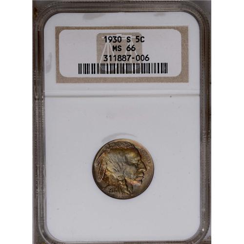 1930-S 5C MS66 NGC. Gold, ruby-red, and olive-gray ton 1930-S[5C] MS66 NGC.